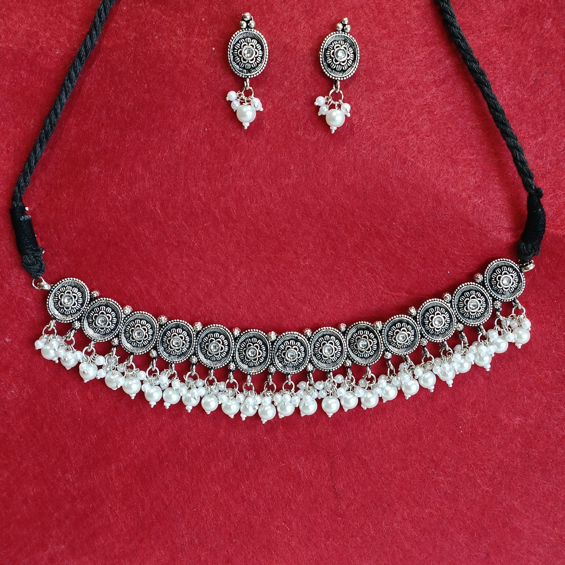 Collection:- Silver Oxidised Plated Kundan Studded Delicate Choker Necklace Set