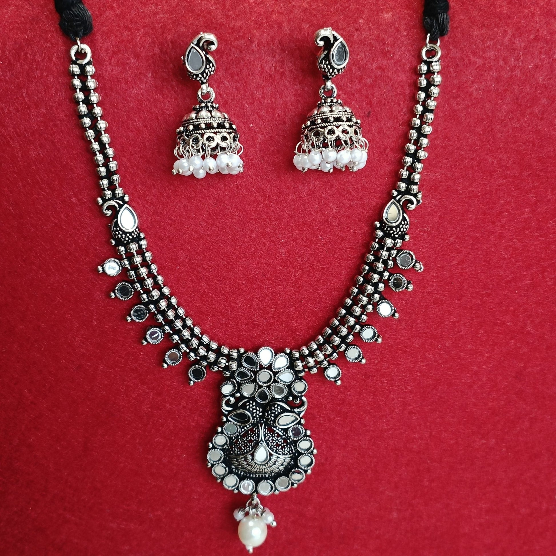 Collection:- Silver Oxidised Plated Mirror Studded Trendy Design Pearl Choker Necklace Set