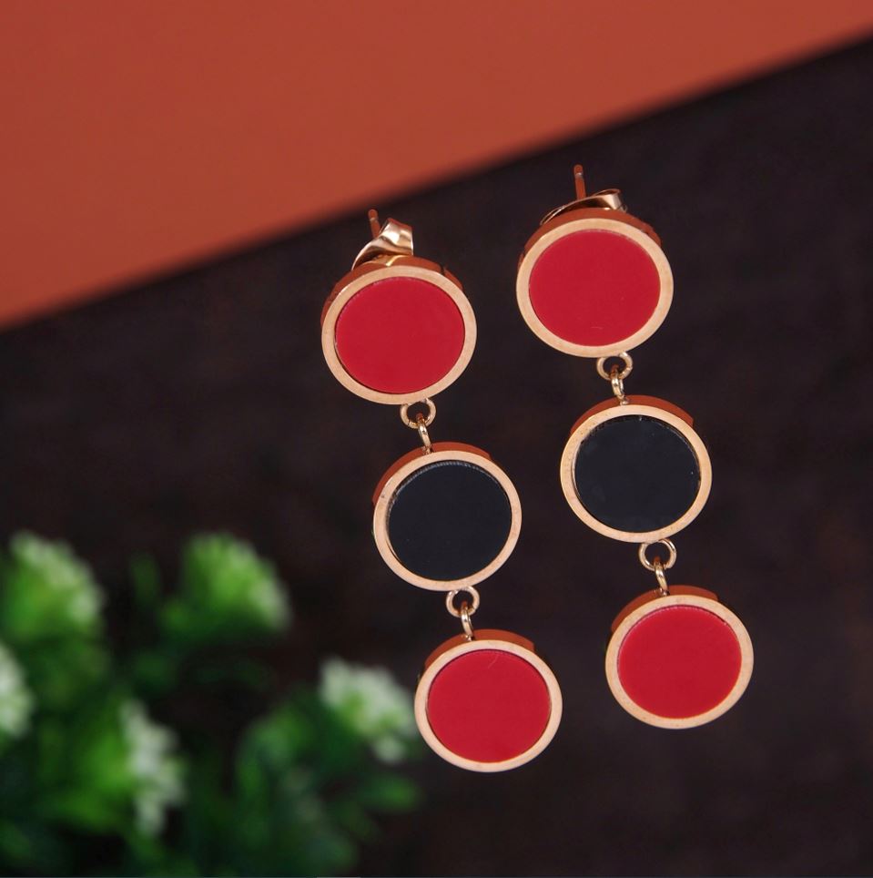 Stainless Steel Rosegold Plated Three Disc Red & Black Coloured Earring